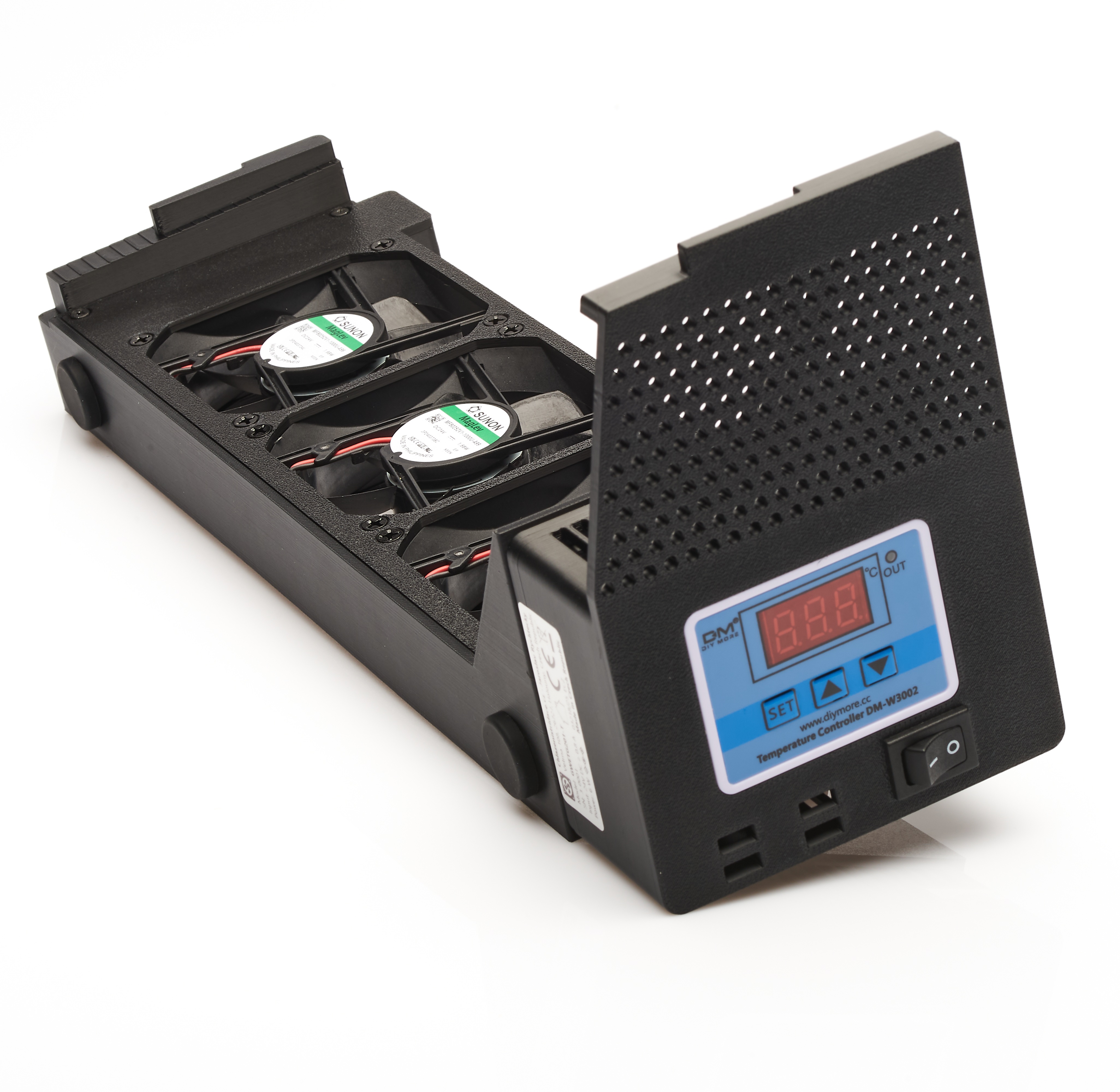 The active cooling draws air in from the underside of the unit. Using it can reduce inverter operating temperature under load by 15–30 °C (depending on installation conditions). This prevents power derating on hot days and extends inverter lifespan. The thermostat is set by default to switch the cooling on at 40 °C and off at 35 °C on the inverter’s heat sink, where the sensor is placed.